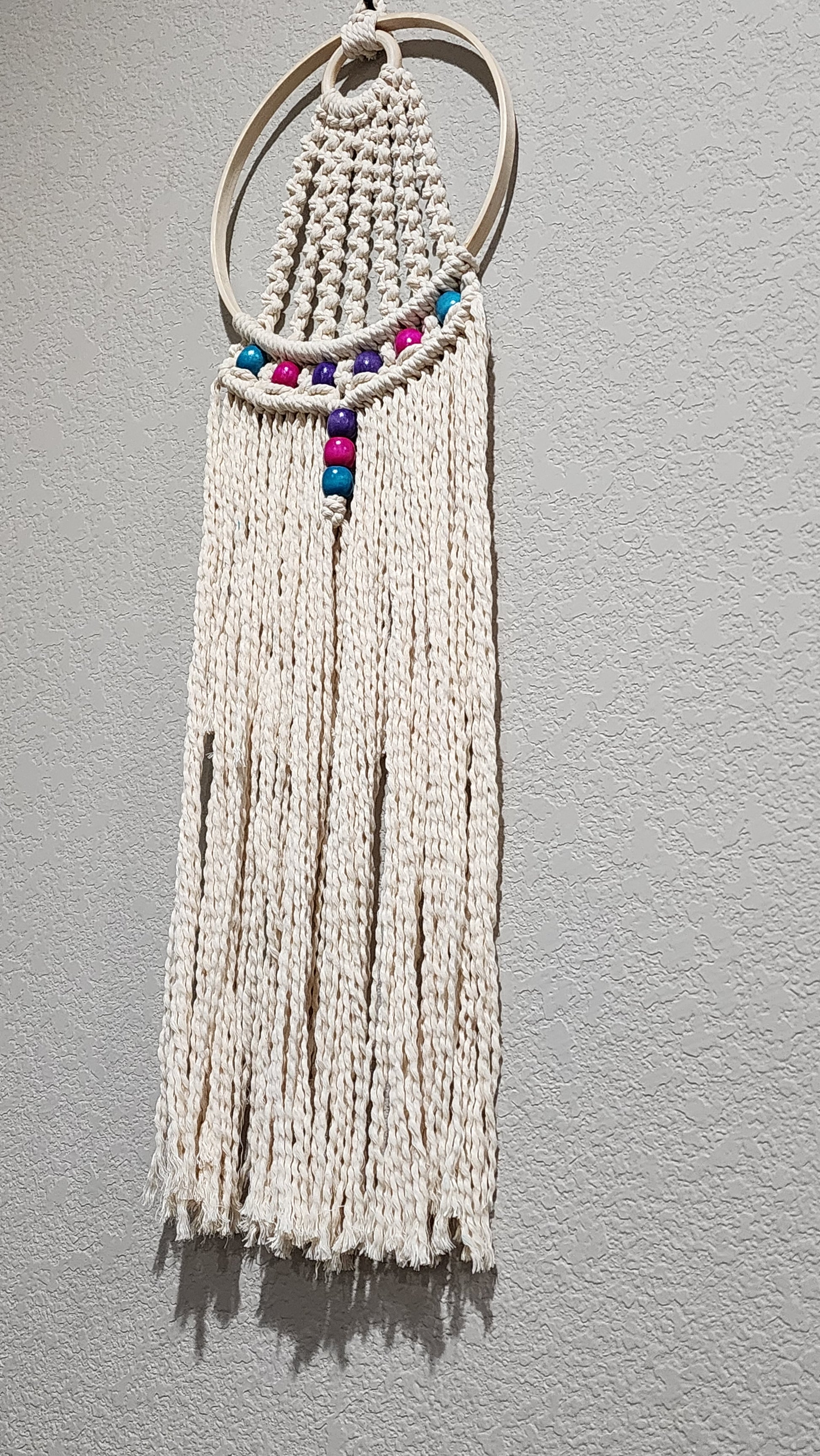 Natural color cotton cording, woven in an alternating half-hitch pattern, and brightly colored wooden beads evokes thoughts of a comfy and cool crop top worn on hot summer days.