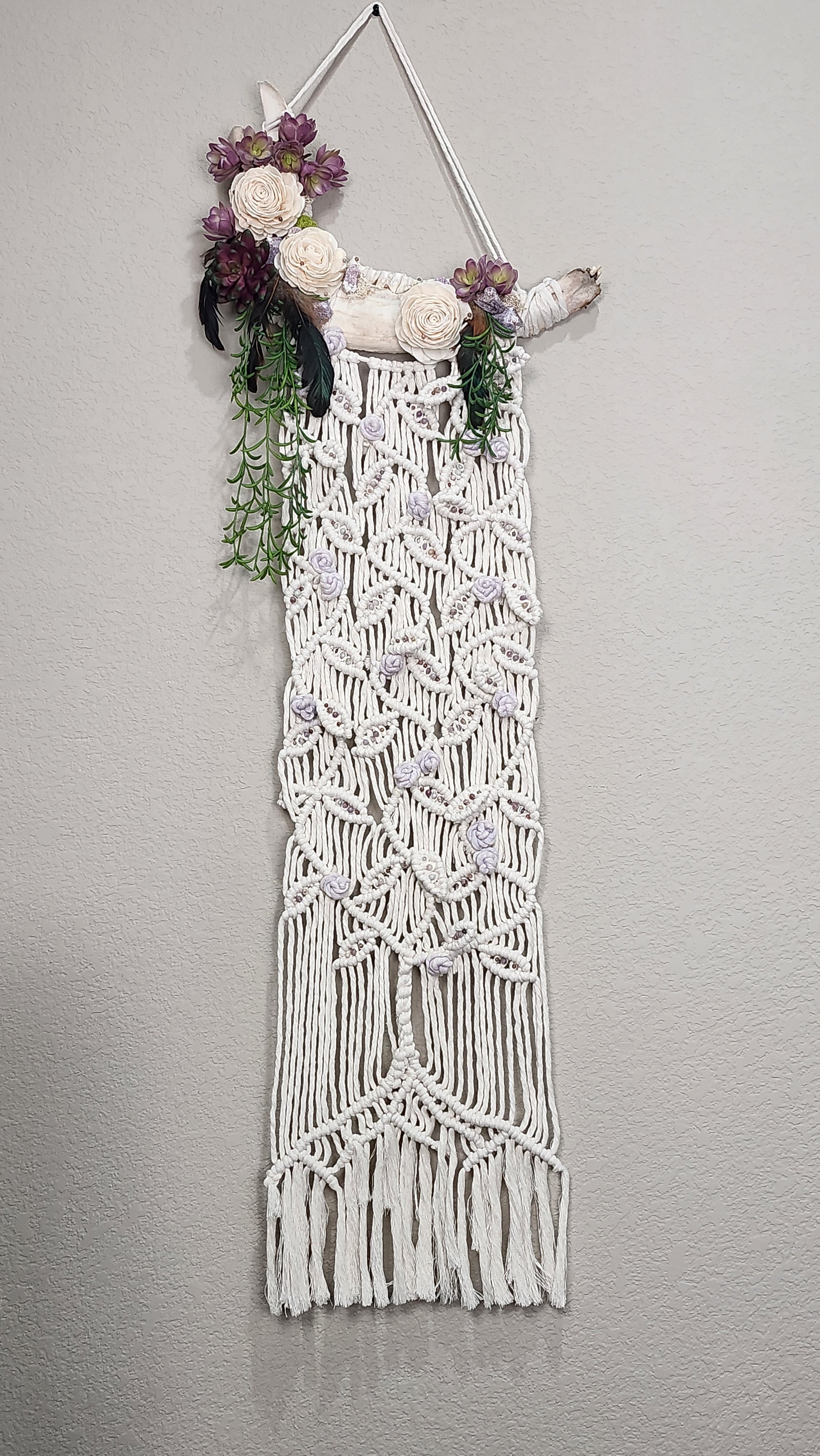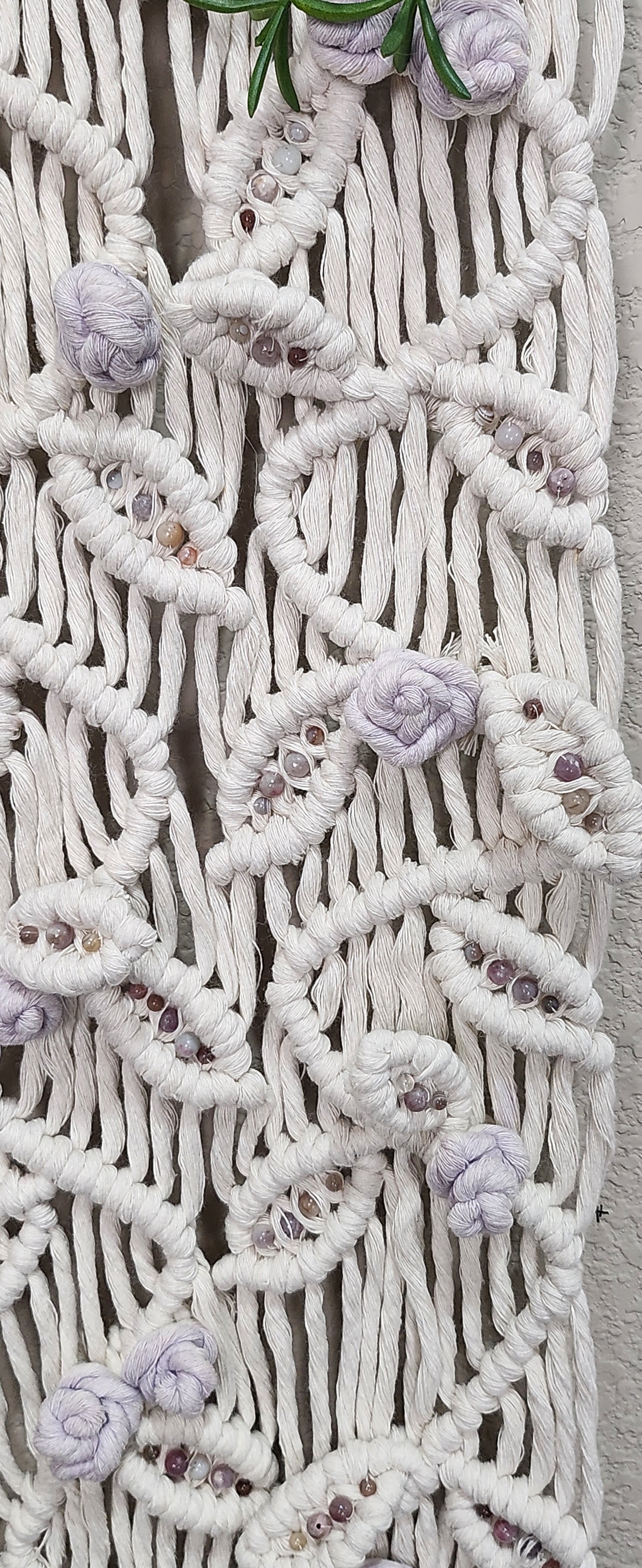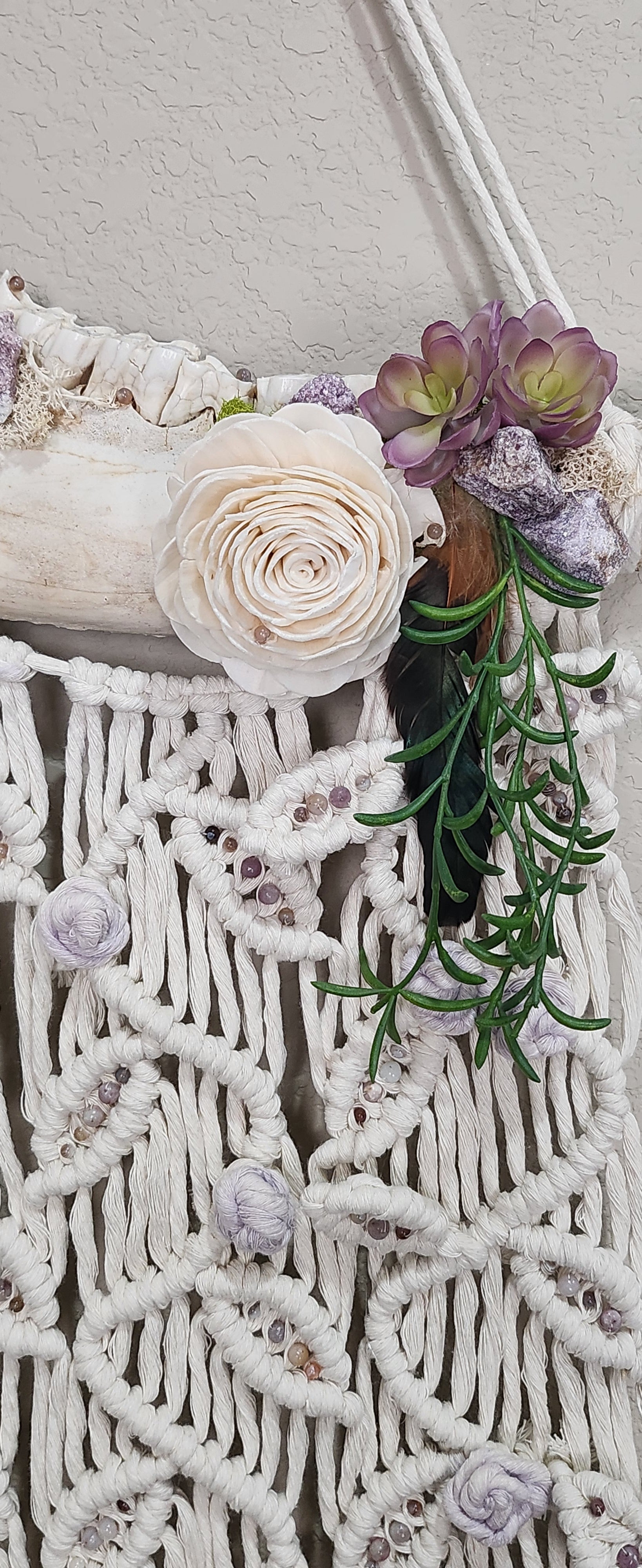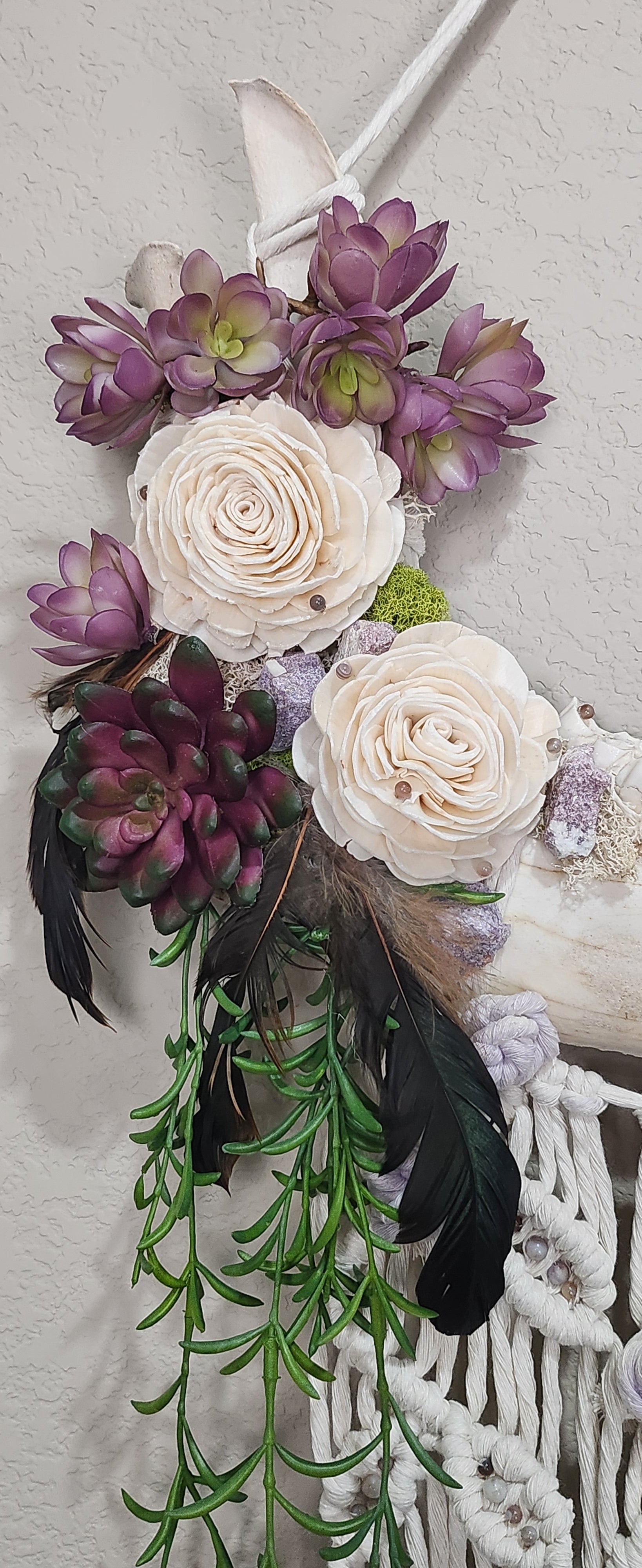 Pale purple rosettes climb vines adorned with lepidolite beads. A bovine jawbone evokes the feeling of the desert, with succulents, roses, and lepidolite stones.
