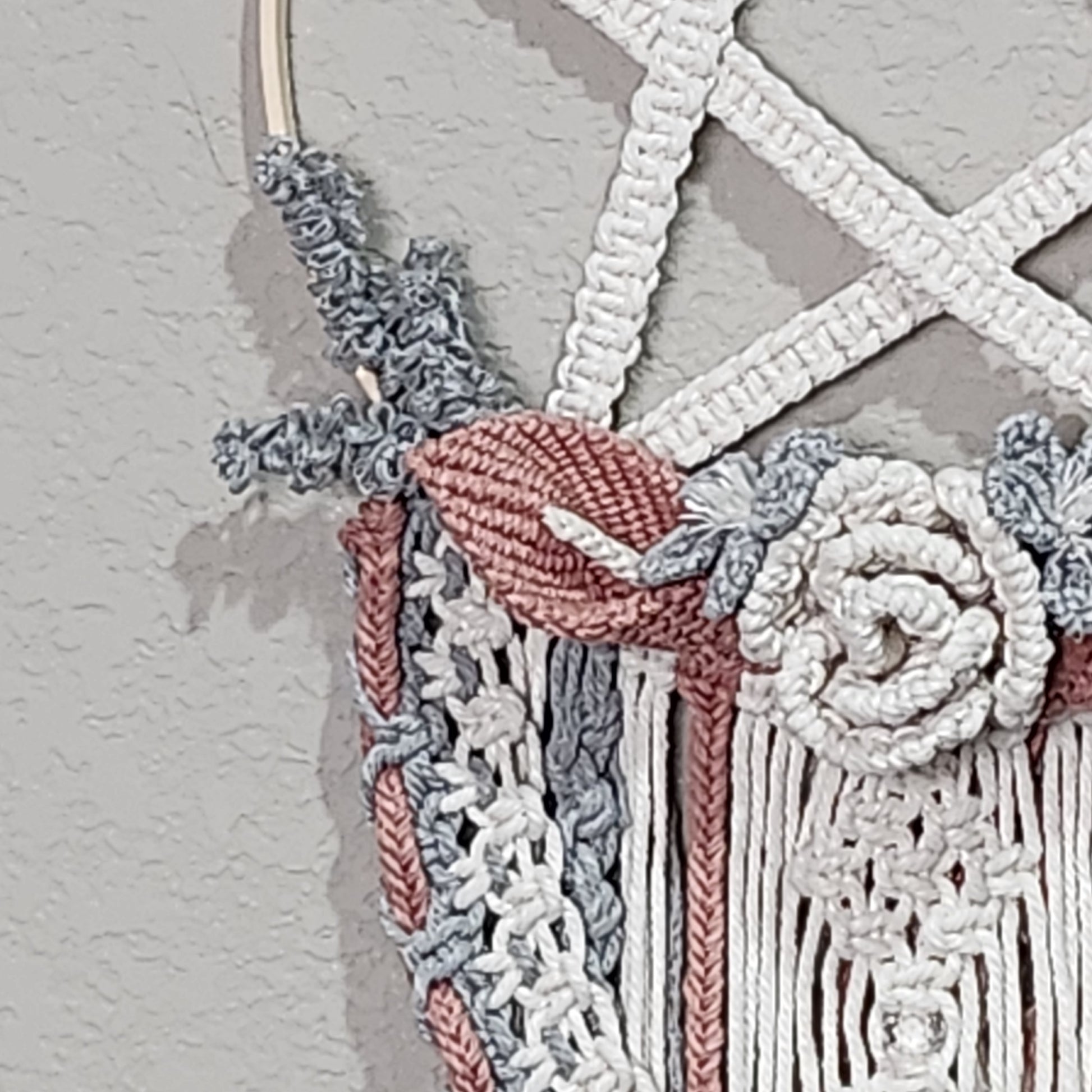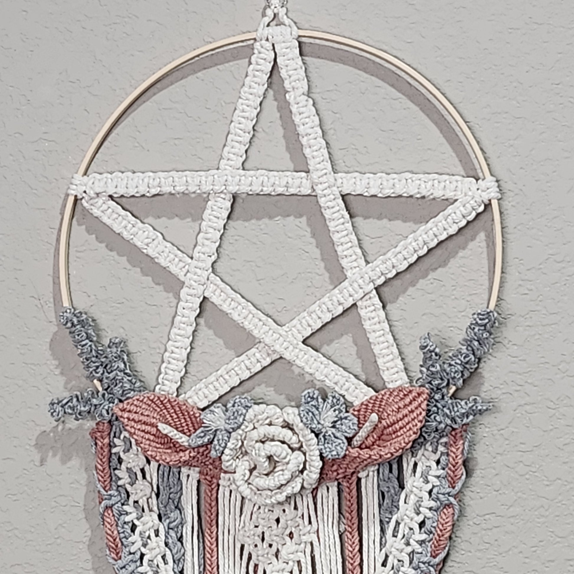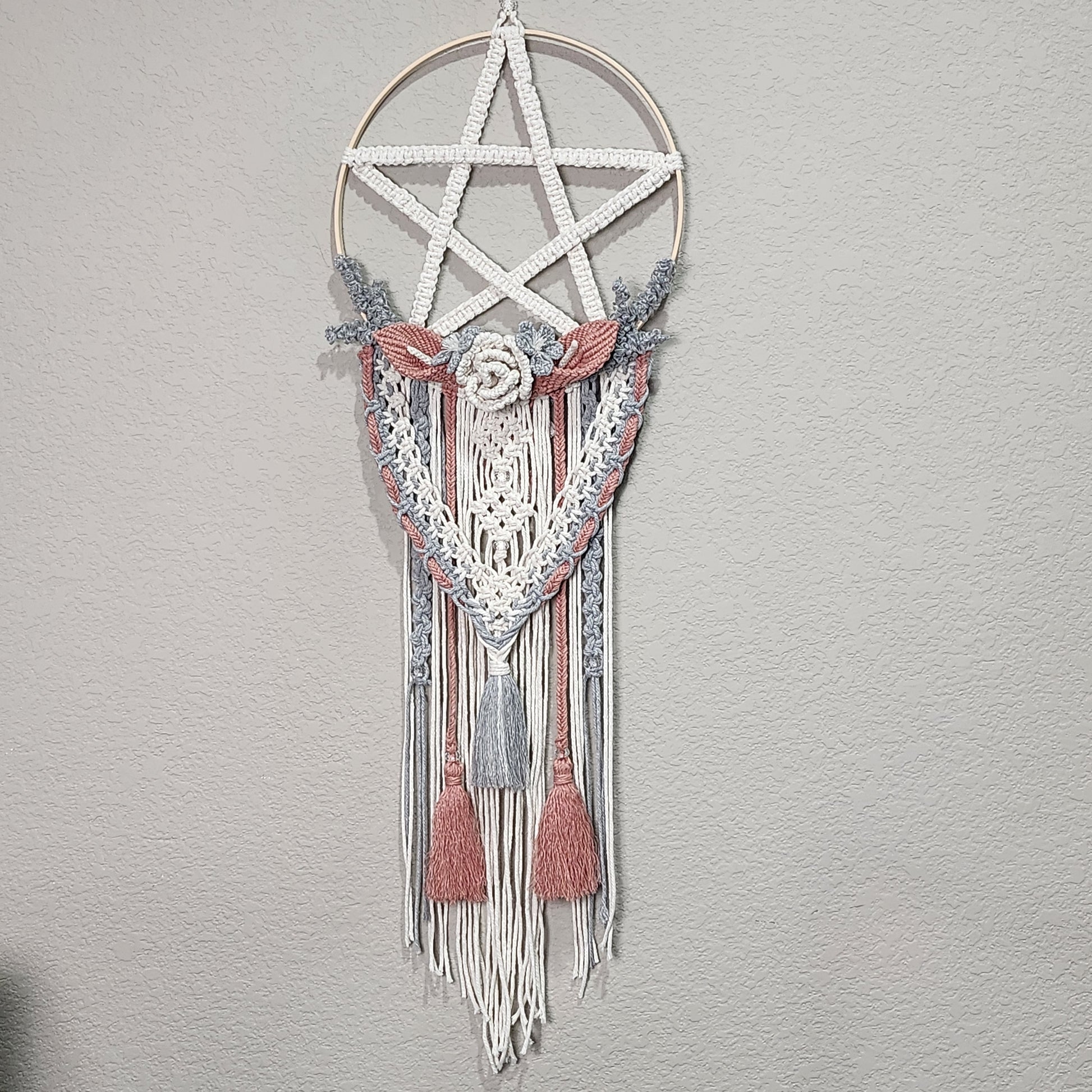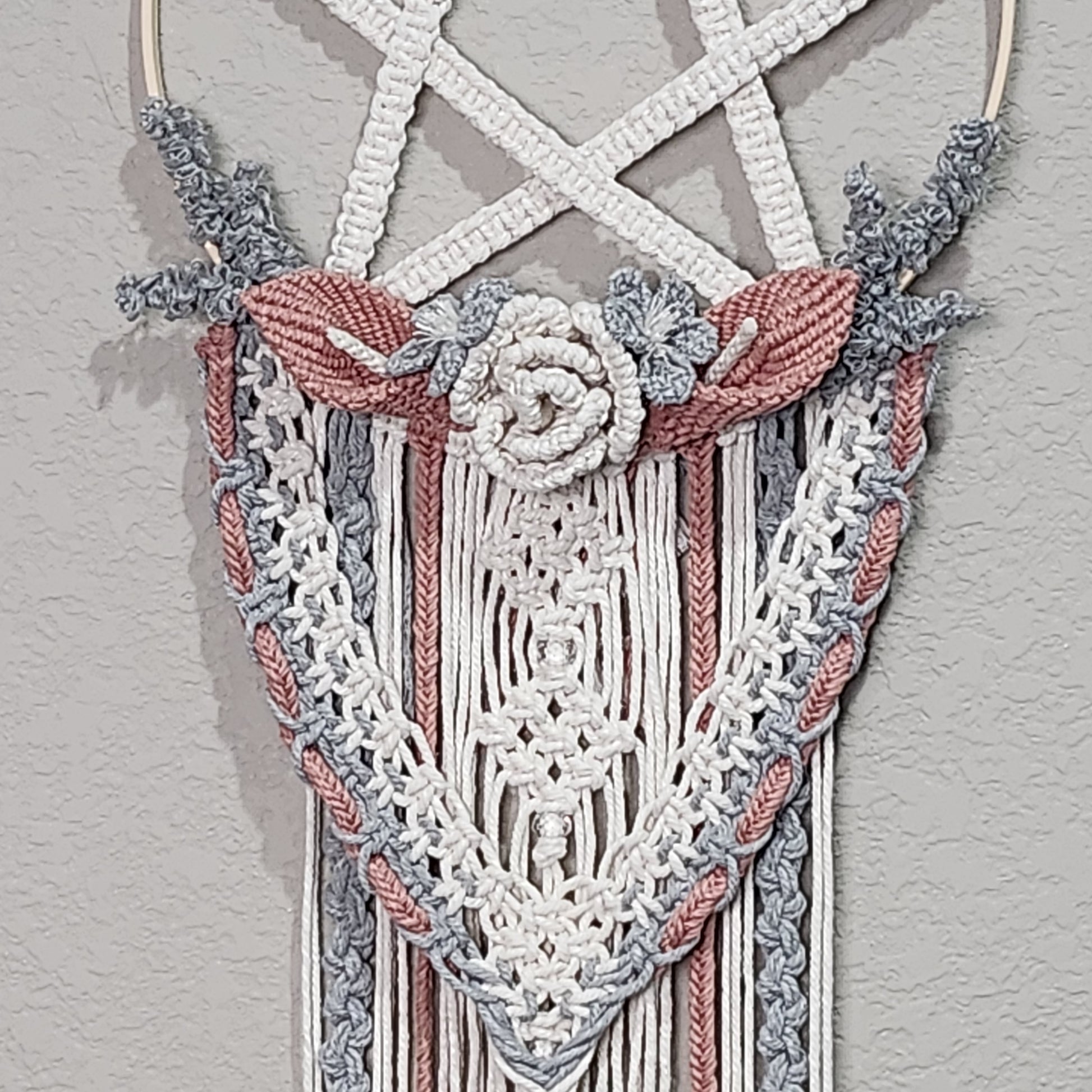 Pentacle macrame wall hanging in soft shade of white, grey, and blush. 12 inch bamboo hoop with hand-tied flowers, clear glass beads, and intricate patterns. Wall hanging is 12"x36".